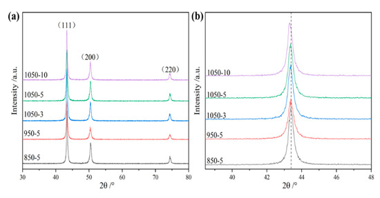 It can be observed that with the increase in the sintering temperature and extension of the holding time, the lattice constant of the alloy increases, and the interplanar spacing of the (111) plane in the FCC structure consequently expands. To satisfy Bragg’s law, the value of sinθ must decrease, leading to a reduction in the diffraction angle θ, which manifests as an overall leftward shift of the 2θ diffraction peaks for the alloy’s FCC structure. However, due to the minimal magnitude of this shift, the variation in the lattice constant appears insignificant. As the holding time is prolonged, grain growth occurs. According to Scherrer’s formula, the full width at half maximum is inversely proportional to the crystallite size, which aligns well with the experimental results.