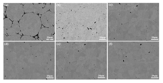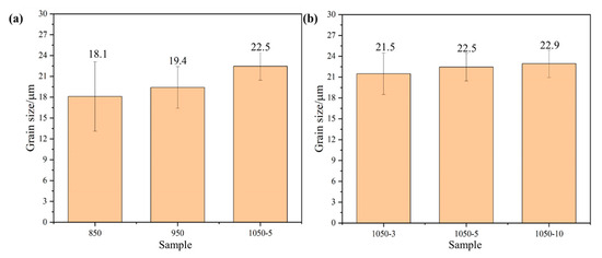 The experimental grain size was measured using Image-pro-plus software (7.0). Figure 4 shows the grain size of the alloy sintered at different temperatures. From the figure, it can be seen that when the sintering temperature is 850 °C, the alloy grain size reaches a minimum of about 18.11 μm, which is because the internal particles of the alloy heat themselves uniformly under the action of Joule heat during plasma sintering, and the atoms on the surface of the particles are in the activation state, so the process of sintered body densification avoids the uneven densification of the alloy caused by heat transfer from the outside to the inside, which leads to the refinement of the grains. With the gradual increase in the temperature and holding time, the grain size of the alloy increases gradually, which is attributed to the increased diffusion driving force at higher temperatures leading to grain growth, but the degree of grain growth is not high.