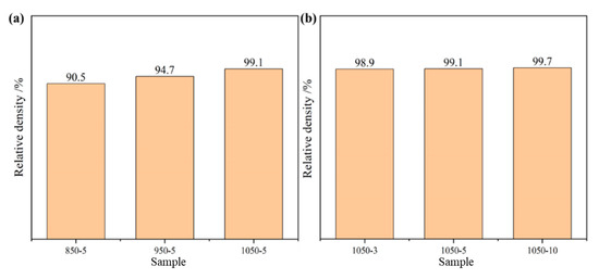 High-entropy alloy relative density: (a) sintered at different sintering temperatures; (b) sintered at different holding times.