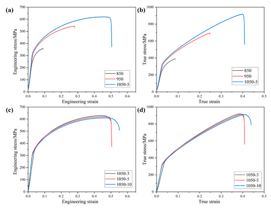Tensile (a,c) engineering stress–strain curves and (b,d) true stress–strain curves of high-entropy alloys sintered at different sintering temperatures and holding times at room temperature.