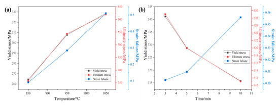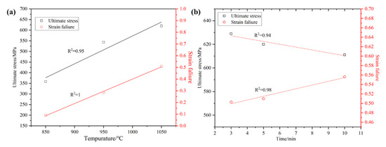 Figure 9 shows the yield strength, tensile strength, and elongation graphs, which can be more intuitively seen as the trends in the yield strength, tensile strength, and elongation of the alloy with the increase in temperature and holding time. At a certain sintering temperature and holding time, the sintered alloy’s strength and elongation shows a linear fit to the line segment shown in Figure 10. With the increase in temperature and the extension of the holding time, the tensile strength and elongation shows a certain regularity. When the sintering temperature is increased from 850 °C to 1050 °C, the tensile strength and elongation of the alloy show a linearly increasing trend. When the holding time is increased from 3 min to 10 min, the alloy tensile strength shows a linear decreasing trend and the elongation shows a linear increasing trend.