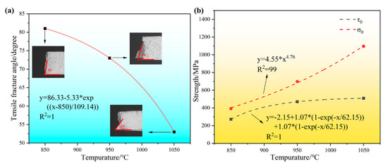 The plots of the σ0 and τ0 functions for the samples prepared at the 850 °C, 950 °C, and 1050 °C sintering temperatures, respectively, are shown in Figure 11b. From the Figure 11b, it can be seen that with the increase in the sintering temperature, the critical normal fracture strength σ0 shows a gradually increasing trend, and the selection of the formula y = 4.55 x4.76 to fit it found that the fitting R2 = 0.99, and the fitting effect is good. The shear fracture strength τ0 firstly rises and then gradually tends to level off, and y = −2.15 + 1.07 × (1 − exp(−x/62.15)) + 1.07 × (1 − exp(−x/62.15)) + 1.07 × (1 − exp(−x/62.15)) is chosen to fit it, and the fitting R2 = 1, which is a good fitting effect. From the critical normal fracture strength σ0 and shear fracture strength τ0 fitting images, it can be seen that with the increase in the sintering temperature, the critical normal fracture strength σ0 shows an obvious rising trend, and when the sintering temperature reaches a certain temperature, the shear fracture strength τ0 no longer rises, resulting in a gradual decrease in the tensile fracture angle. The plots of the σ0 and τ0 functions for the samples prepared with 3 min, 5 min, and 10 min holding times, respectively, are shown in Figure 12b. From the Figure 12b, it can be seen that with the increase in the holding time, the critical normal fracture strength σ0 shows a gradual increase in the trend, the selection of the formula y = 56.53 × exp (−x/−5.71) + 959.13 to fit it showed that the fitting R2 = 0.99, so the fitting effect was good. The shear fracture strength τ0 shows a gradual decrease, and y = 620.41 − 64.68 × (1 − exp(−x/2.63)) − 64.68 × (1 − exp(−x/2.63)) is chosen to fit it, and the fitting R2 = 0.99, so the fitting effect is good. From the critical normal fracture strength σ0 and shear fracture strength τ0 fitting images, it can be seen that with the increase in the holding time, the critical normal fracture strength σ0 shows a significant rising trend, while the shear fracture strength τ0 shows a gradual decline in the trend of the rise in the critical normal fracture strength σ0 and the decline of the shear fracture strength τ0 leads to a gradual decrease in the tensile fracture angle. With the increase in the sintering temperature and holding time, the high-entropy alloy sample gradually tends to be dense; the reduction in alloy pores, the full diffusion of elements, and the full combination of particles are the main reasons for the rise in σ0, and the final sample fracture mode gradually evolves from forward fracture to shear fracture.