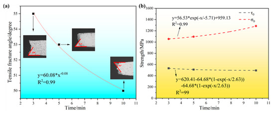 Different holding times: (a) relationship of tensile shear fracture angle with the increase in the equivalent strain; (b) variations in τ0 and σ0 as a function of the imposed strain.