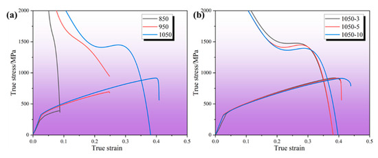 Figure 13 shows the true stress–strain versus strain hardening curves of the high-entropy alloy samples prepared at different sintering temperatures and holding times. From Figure 13a, it can be seen that, in the sintered samples prepared at 850 °C in the low-strain region, the strain hardening rate is very fast, and with the continuation of tensile testing, the strain rate gradually slows down and then continues to decline rapidly until the tensile samples fracture. The samples prepared by sintering at 950 °C also show three stages: firstly, a rapid decline, followed by a leveling off, and finally, a continued rapid decline. There is a slight increase in the work hardening region compared to the sintered samples prepared at 850 °C. The samples prepared by sintering at 1050 °C show three stages of rapid decline, followed by a slow increase and finally a continued rapid decline. Compared to the samples prepared by sintering at 850 °C and 950 °C, the work hardening region increases significantly, which is mainly due to the reduction in internal pores, more homogeneous bonding between elements, and the generation of twins in the high-entropy alloys as the temperature increases. From Figure 13b, it can be seen that the samples prepared under the holding time of 3 min, 5 min, and 10 min, respectively, show three stages of rapid decrease, then slow increase, and finally, rapid decrease. The intersection of the stress–strain curves and strain hardening curves of the three samples occurs at higher strains. The intersection of the true stress–strain curves of the samples prepared at a holding time of 3 min is slightly lower than that of the samples prepared at a holding time of 5 min, and both intersections are lower than that of the samples prepared at a holding time of 5 min. Due to the delay in necking, the ductility of the samples prepared with a holding time of 10 min is the highest and the ductility of the samples prepared with a holding time of 3 min is the worst.