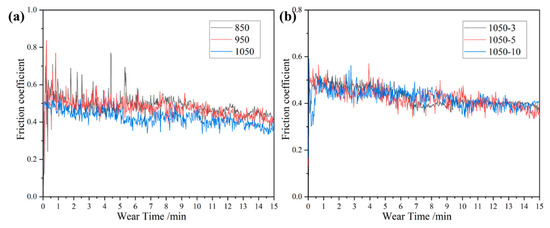 Figure 15 shows the friction coefficient–time curves of the sintered alloys at different sintering temperatures and holding times. From the Figure 15, it can be seen that, at the beginning of the test, the interface is very rough and the contact area with the grinding ball is very small. When the grinding ball is worn, a cold welding effect occurs, which requires a large shear force to cut it, causing the friction coefficient to increase rapidly [17]. With the increase in the wear time, the contact area increases and the interface becomes a smooth friction layer, so that the friction coefficient gradually stabilizes. The friction coefficients of the samples under different conditions, shown in the Figure 16, show large fluctuations, which are mainly due to the periodic accumulation and elimination of wear debris from the wear surface [18,19]. The friction coefficient increases with the accumulation of wear debris on the wear surface. The coefficient of friction decreases when the wear debris separates from the wear surface or fills in the cracks. Among them, the porosity in alloys 850 and 950 causes localized fractures. Therefore, the localized fracture caused by porosity is the reason for the large fluctuation in the friction coefficient [17,18,19,20].