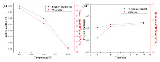 Average friction coefficient and wear rate: (a) sintered at different sintering temperatures; (b) sintered at different holding times.