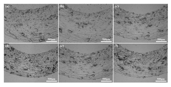 Wear morphology of high-entropy alloy sintered at different sintering temperatures and holding times: (a) 850; (b) 950; (c) 1050-5; (d) 1050-3; (e) 1050-5; (f) 1050-10.