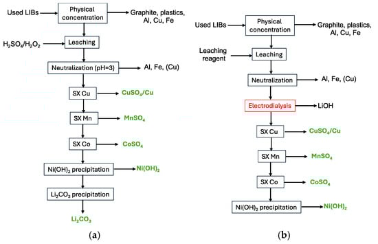 (a) Typical hydrometallurgical flowsheet and (b) implementation of electrodialysis in battery recycling flowsheet (SX: solvent extraction).