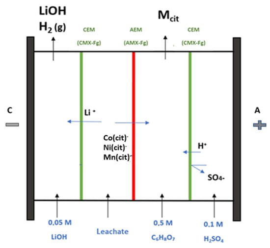Studies reported in the literature have focused on the use of electrodialysis in inorganic acids to separate lithium from divalent metals contained in aqueous solutions representative of leachates of LIB black masses (BMs). More and more works have aimed at investigating the use of inorganic acids to leach BMs or cathode materials from LIBs [12], whereas only a few papers have addressed the use of electrodialysis to process leaching solutions of BMs or cathode materials or representative solutions of leachates by organic acids. For instance, Chan et al. (2022) [5] studied the use of electrodialysis (ED) to separate lithium(I), cobalt(II), nickel(II), and manganese(II) contained in an aqueous solution resulting from the leaching of LiNi1/3Mn1/3Co1/3O2 cathode material by EDTA in the presence of H2O2. Nickel was recovered at approximately 99% at pH 2. In a second step, cobalt was separated with a yield of 87.3% at pH 3. Finally, the separation of lithium(I) and manganese(II) was performed using a monovalent-selective cation exchange membrane (Neosepta® CMS), with a separation yield of 99%. Likewise, Iizuka et al. [8] used bipolar membrane electrodialysis to separate lithium and cobalt contained in an aqueous solution produced by leaching LiCoO2 electrodes with EDTA to form the complex Co(EDTA)2− at pH = 4. A faradic efficiency of 99% for both metals was achieved.