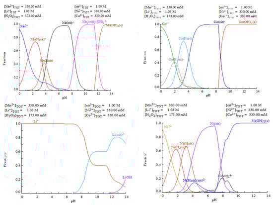 Speciation diagrams of manganese(II), cobalt(II), lithium(I), and nickel(II) in citric acid at 25 °C calculated for an aqueous solution, for which the composition is as follows: [Mn2+] = 330 mmol L−1; [Co2+] = 330 mmol L−1; [Ni2+] = 330 mmol L−1; [Li+] = 1.03 mol L−1; [H2O2] = 173 mmol L−1; and [Cit3−] = 1 mol L−1 (calculation performed by using the Medusa software v1 with its database).
