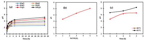 Effect of (a) solid-to-liquid ratio (S/L) (30 °C, %H2O2 (vol) = 2%), (b) H2O2 (%vol.) (S/L = 100 g/L, 30 °C, 24 h), and (c) temperature (S/L = 100 g/L, 8% H2O2) on the final pH value after leaching.