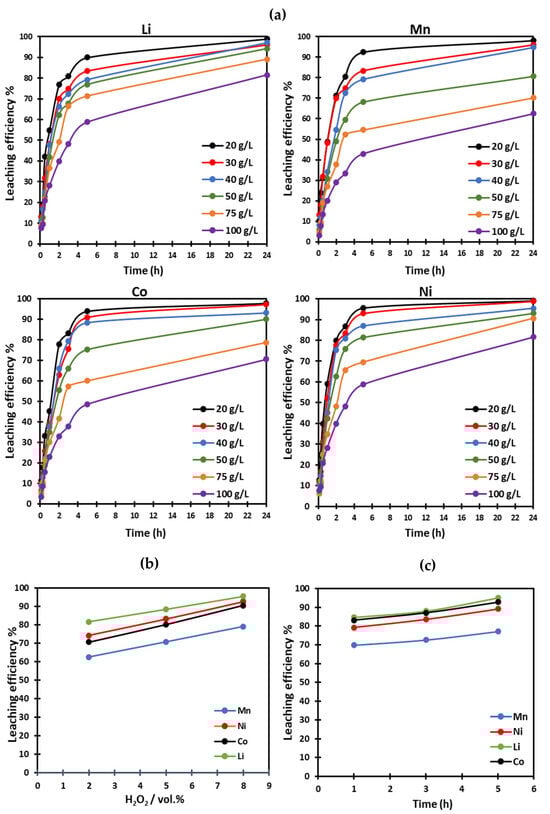 Effect on leaching efficiencies of (a) solid-to-liquid ratio (S/L) (30 °C, %H2O2(vol.) = 2%), (b) H2O2 (%vol.) (100 g/L, 30 °C, 24 h), and (c) time (100 g/L, 8% H2O2, and 45 °C).
