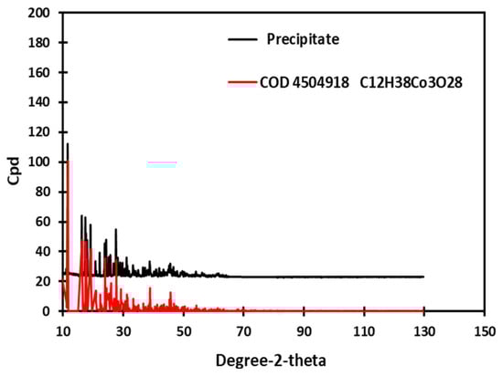 XRD pattern of the precipitate (black) and comparison with the XRD spectrum of tricobalt(II) citrate dihydrate (C12H38Co3O28).
