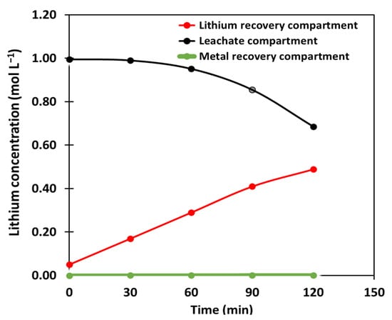 In order to calculate the number of moles of Li transferred to the recovery compartment over time, the mass balance must take into account changes in the volume of the various compartments due to sampling, water transfer by osmosis and electroosmosis, and slight evaporation. A notable decrease in leachate volume is observed in the corresponding compartment, leading to an asymmetry in the concentration curves of the two compartments (leachate and cathodic), as shown in Figure 7.