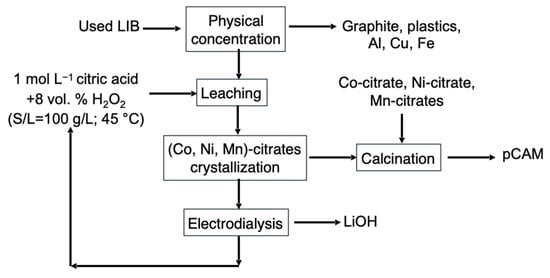 This study paves the way for an alternative approach combining leaching in organic media, electrodialysis, and crystallization, as depicted in Figure 8. After leaching the black mass in citric acid under the optimized conditions established in this study, a crystallization step precedes electrodialysis to maximize the removal of divalent cations—mainly manganese, cobalt, and nickel citrates—and produces a lithium-enriched solution compatible with electrodialysis. The stoichiometry can be adjusted with additional metal citrates before calcination to produce a pCAM suitable for the synthesis of new cathode materials for LIBS (CAM). A final electrodialysis step is then performed to obtain high-purity lithium hydroxide (LiOH). Recycling of the depleted leachate to the leaching step is proposed to improve process sustainability. Its impact on leaching efficiency remains to be explored in future work.