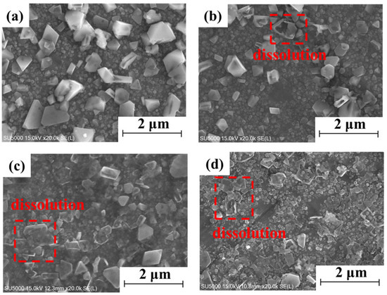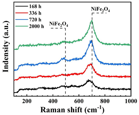 Figure 1 shows the surface morphologies of the 316L SS after exposure to alkaline solutions for different periods. The surface morphologies of 316L after exposure for different durations are significantly different. Spinel oxides are attached to the surface of 316L after exposure for different durations. However, the spinel oxide on the surface of 316L dissolves after exposure for 336 h (Figure 1b). With an increase in exposure time, the degree and quantity of spinel dissolution increase (Figure 1b–d red dashed rectangles). Figure 2 shows the Raman spectra of the 316L SS after exposure to alkaline solutions for various durations. The main spinel-type oxide NiFe2O4 peak is found near 700 cm−1, and a small peak at 490 cm−1 is also found after exposure at different times.