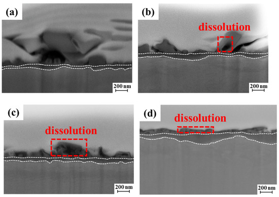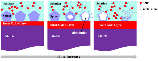 In this study, the spinel oxides dissolved after 336 h of exposure, and the dissolution increased with time (Figure 1, Figure 3, Figure 5, Figure 6 and Figure 7). The composition of the spinel oxides did not change during dissolution. The spinel oxide on the surface of the 316L SS is mainly composed of Fe, Ni, and O and exhibits the structure of NiFe2O4 (Figure 2, Figure 5, Figure 6 and Figure 7). The dissolution of NiFe2O4 is attributed to the uniform dissolution of the elements, and there is no selective dissolution of the elements. The reactions can be described as follows [21,36]: