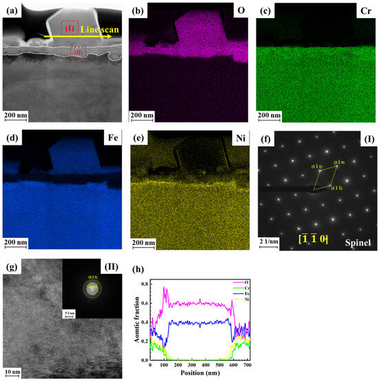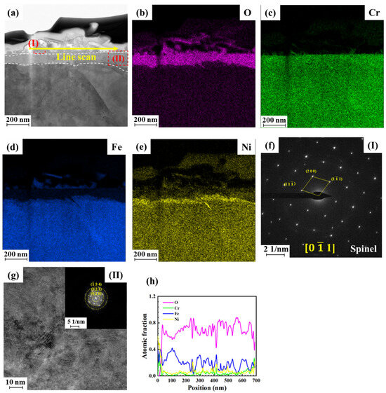 Figure 5 shows the TEM results of the cross-section of the oxide of 316L SS exposed to the alkaline solution for 168 h. As shown in Figure 5a, two oxide layers are visible. The inner layer contains a continuous and compact oxide, whereas the outer layer contains loosely distributed spinel oxides. Owing to the limited area observed by transmission electron microscopy, the thickness of the oxide layer is not measured. Figure 5b–e show the corresponding element mapping results. The inner oxide layer primarily comprises Cr and O, whereas the outer oxide layer is predominantly composed of Fe, Ni, and O. Simultaneously, Ni is unevenly distributed within the spinel oxide, with a concentration observed along its periphery. This is explained in the next section. The SAED and FFT patterns of regions I and II, which are indicated in Figure 5a, are displayed in Figure 5f,g, respectively. The outer oxide layer consists of a single-crystal spinel NiFeO4, while the inner layer exhibits nanocrystalline properties, likely composed of Cr2O3/CrOOH. This is consistent with the Raman results. Figure 5h shows the line scan result of the arrow in Figure 5a. It can be found that the spinel oxide is composed of Fe, Ni, and O, and Ni is mainly concentrated at the edge of the spinel.