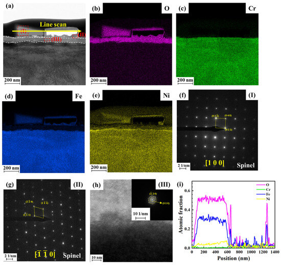 The TEM results of a cross-section of the oxide of 316L SS exposed to the alkaline solution after 336 h: (a) TEM image, (b) O EDS mapping, (c) Cr EDS mapping, (d) Fe EDS mapping, (e) Ni EDS mapping, (f) the SAED pattern of area I in (a), (g) the FFT pattern of area II in (a), (h) the FFT pattern of area III in (a), (i) line scan of the arrow shown in (a).