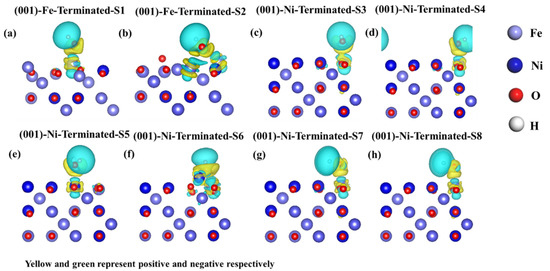DFT calculations reveal the dissolution process at the atomic scale to further understand the dissolution behavior of spinel oxides in an alkaline solution. The adsorption of OH− on the spinel oxide surface in an alkaline solution should be considered first. Figure 8 shows the adsorption sites of OH− on different layers of the NiFe2O4 (001) surface and the optimized atomic structure at different adsorption sites of the NiFe2O4 (001) surface. In the (001)-Fe-terminated layer, the change in the OH− site at the top is not obvious (S1), and the change in the OH− site in the bridge is more obvious (S2), which is close to the top site. In the (001)-Ni-terminated layer, the OH− at S3 and S5 did not change significantly, and the OH− at other sites changed significantly, all of which are close to the top site. The adsorption energies are listed in Table 3. It was found that OH− was easily adsorbed on the NiFe2O4 (001) surface. The bond length between O and Fe (Ni) is approximately 1.8~2 Å, and the bond length between O and H is 0.98 Å. The O-H bond lengths change slightly after adsorption, indicating that adsorption does not tend to dissociate the O-H bond. Figure 9 shows the differential charge diagram for the different adsorption sites of the NiFe2O4 (001) surface. Yellow and green represent positive and negative correlations, respectively (the colors can be seen in the online version). It is found that charges flowed from the metal atoms to OH− on the (001) surface. The charge density of the OH−-centered region increased, whereas that of the surface Fe and Ni atoms decreased due to the loss of electrons. This suggests that the OH− bond with surface atoms mainly through ionic bonding.
