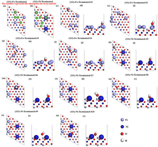 (a,b) The adsorption sites of OH− on different layers of the NiFe2O4 (111) surface, (c–v) the optimized atomic structure at different adsorption sites of the NiFe2O4 (111) surface.