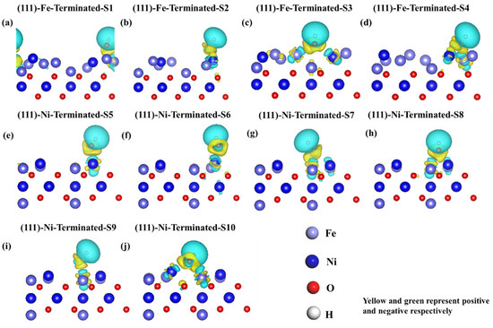 Figure 10 shows the adsorption sites of OH− on different layers of the NiFe2O4 (111) surface and the optimized atomic structure at different adsorption sites of the NiFe2O4 (111) surface. In the (111)-Fe-terminated layer, the change in the OH− site at the S1 site is not obvious, and the OH− sites at other positions have changed significantly, all of which are close to the top site. In the (111)-Ni-terminated layer, the change in the OH− site at most sites is not obvious; only the OH− at the S8 and S10 sites changes significantly, moving from the bridge site to the fcc-site and from the hcp-site to the top site, respectively. The adsorption energies are listed in Table 4. It is found that OH− is easily adsorbed on the NiFe2O4 (111) surface. The bond length between O and Fe (Ni) is approximately 1.8~2Å, and the bond length between O and H is 0.98 Å. The O-H bond lengths change slightly after adsorption, indicating that adsorption does not tend to dissociate the O-H bond. Figure 11 shows the differential charge diagram for the different adsorption sites on the NiFe2O4 (111) surface. Yellow and green represent positive and negative correlations, respectively (the colors can be seen in the online version). It can also be observed that charges flow from the metal atoms to OH− on the (111) surface, similar to Figure 9. Comparing Table 3 and Table 4, it can be found that OH− is strongly adsorbed on the NiFe2O4 surface, and the (111) surface may be easier to begin to dissolve first, which is consistent with the TEM results (Figure 6 and Figure 7).