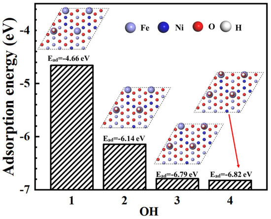 The dissolution of spinel oxides has not been observed in many experiments in a neutral environment [11,16,33,34,35]. It can be seen that the dissolution of spinel is dependent on pH value. The change in pH leads to a shift in the OH− coverage on the spinel surface. A model of OH− with different coverages on the NiFe2O4 surface is established, and the adsorption energy is calculated. Figure 12 shows the adsorption energy calculation results for the NiFe2O4 (111) surface with different OH− coverage. The adsorption energy moves in a more negative direction with increasing OH− coverage. This indicates that the adsorption capacity of OH on the surface of Ni increased with increasing pH. The adsorption energy of each OH− adsorption is also calculated as the coverage increases, as shown in Figure 13. It can be found that OH− is easily adsorbed on the surface with the increase of OH− coverage. This indicates that the dissolution rate of NiFe2O4 also increases at high pH values.