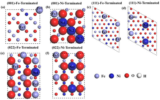 The ejection energy describes atomic dissolution. The smaller the ejection energy, the easier it is for the atoms to dissolve [30]. Based on the NiFe2O4 observed by TEM, (001), (111), and (022) surfaces are constructed, and their atomic ejection in a certain order is calculated (Figure 14). The eject energy is listed in Table 5. It can be found that the atomic ejection energy on the NiFe2O4 (111) (Figure 14c) crystal plane is smaller than that on other crystal planes. This means that the atoms of the NiFe2O4 (111) crystal plane are easier to dissolve, which is consistent with the TEM results. Meanwhile, the ejection energy of Ni in the same layer is lower than that of other atoms, indicating that Ni is easier to dissolve in the same layer. This may also lead to the segregation of Ni in NiFe2O4.