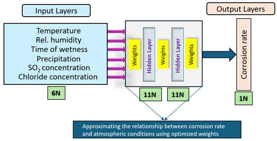 The very weak correlation between SO2 concentration and RH (~0.026) suggests that humidity does not notably affect SO2’s influence on corrosion. The heatmap provides preliminary insights into the most important environmental factors, such as chloride concentration, RH, and the TOW, which were selected as features for training the ANN model. These correlations guided the model’s input direction, ensuring that the most influential variables were included in the analysis.
