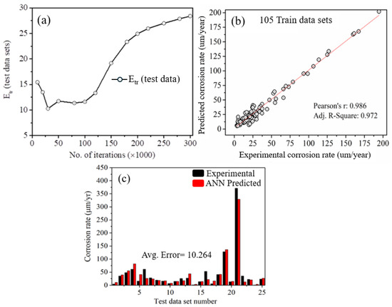 The variation in the average training error ( E t r ) for the test data as a function of iterations is shown in Figure 2a. As the number of iterations increased from 5000 to 30,000, the error gradually decreased to approximately 10. However, after 50,000 iterations, a significant increase in the error value was observed, indicating overfitting of the model. Consequently, the optimal number of iterations was determined as 30,000. Model regularization was achieved through early stopping, which effectively minimized overfitting in this case. The selection of other hyperparameters based on the prediction error is provided in the Supplementary Data (Figures S1 and S2). To prevent overfitting, early stopping was performed by monitoring the variation in the test error with iterations. Beyond 30,000 iterations, the test error increases, indicating overfitting. Therefore, the model was trained for up to 30,000 iterations. The strong agreement between the experimental and predicted values, as well as the consistency with known corrosion trends, supports the reliability of the model. The developed ANN model consisted of an input layer with six neurons corresponding to atmospheric variables, two hidden layers (each containing 11 neurons), and a single output neuron for corrosion rate prediction, forming a 6-11-11-1 architecture. The selection of this architecture was based on systematic hyperparameter tuning to balance the complexity and predictive accuracy. The model was trained using a backpropagation algorithm with 30,000 iterations, a 0.3 learning rate, and a 0.9 momentum term. To prevent overfitting, early stopping was applied, and model performance was rigorously assessed using an independent test dataset. While dropout was not applied due to the shallow architecture and relatively small dataset, overfitting was effectively controlled through early stopping and careful hyperparameter tuning, as supported by the trends shown in Figure 2a.