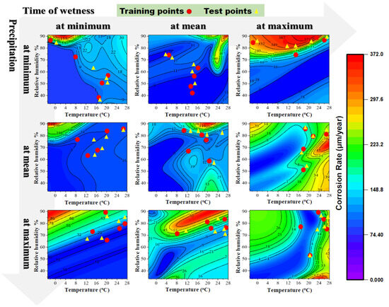 Figure 4 illustrates the predicted corrosion rate of carbon steel as a function of temperature (0–28.2 °C) and RH (33.3–91.1%) at varying wetness and precipitation times. For this analysis, SO2 and chloride concentrations were held constant at their minimum values. The data revealed that, under minimum atmospheric conditions, a maximum corrosion rate of 155 μm/year occurs in regions with low temperatures (<8 °C) and high humidity (≈90%). This underscores the critical role of humidity in accelerating corrosion even at lower temperatures. When the TOW was at its minimum (0.003) and precipitation increased to its mean value (1093.42 mm), the corrosion rate increased to ~340 μm/year, likely due to increased surface moisture facilitating electrochemical reactions. Interestingly, when the precipitation was further increased to its maximum value (4656 mm), the corrosion rate decreased to ~89 μm/year, possibly because of a washing-off effect, where excessive rainfall removes accumulated corrosive agents from metal surfaces. To improve the interpretability of the model output, the training and test data points were overlaid on the representative central plot in Figure 4 (corresponding to the mean values of precipitation and TOW). These corrosion regions are supported by training data points (red circles), and yellow triangles represent test data distributed in plots, confirming that the observed nonlinear trends in the contour plot stem from the data itself rather than from model overfitting, thus reinforcing the predictive reliability of the ANN model.