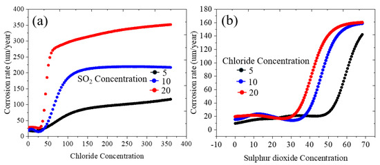 Figure 5. Predicted corrosion rate of carbon steel as a function of (a) chloride and (b) sulfur dioxide concentrations. The other variables are kept at a minimum.