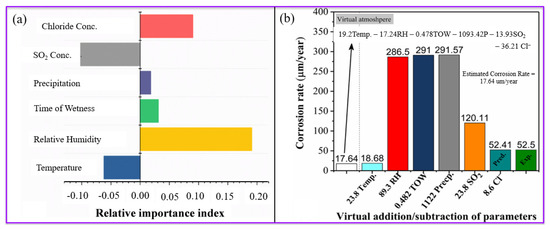 Figure 6. (a) Qualitative (relative importance index) and (b) quantitative influence of atmospheric conditions on the corrosion rate of carbon steel. The estimated behavior is for Dataset #15.