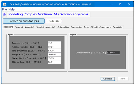 The ANN model was trained using the C program, and the GUI was developed using Java version 1.4, to enable cross-platform compatibility and efficient deployment. As shown in Figure 7, the GUI enables the accurate prediction of corrosion rates for infinite combinations of six input parameters: temperature, RH, the TOW, precipitation, SO2 concentration, and chloride concentration.