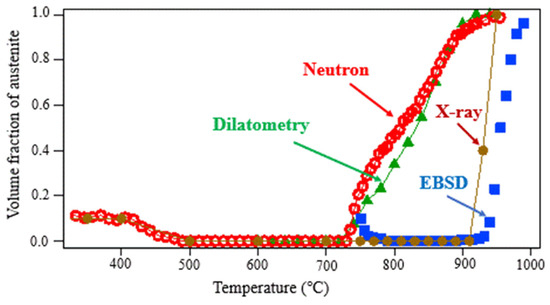 Changes in the austenite volume fraction upon heating for TR2, determined by various methods (1.5Mn-1.5Si-0.2C steel). Reprinted from Ref. [1].