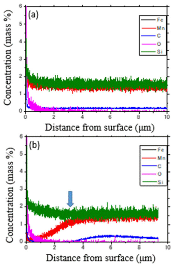 Chemical compositions as a function of the depth from surface obtained by rf glow discharge optical emission spectroscopy for the EBSD specimens: (a) specimen not heated and (b) the specimen after in situ EBSD measurement (1.5Mn-1.5Si-0.2C steel). Reprinted from Ref. [1].