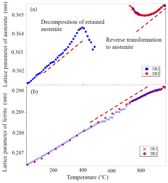 Changes in the austenite and ferrite lattice parameters determined by neutron diffraction with heating for TR2 and TR3 (1.5Mn-1.5Si-0.2C steel) (a) austenite and (b) ferrite. Reproduced with permission from reference [1].