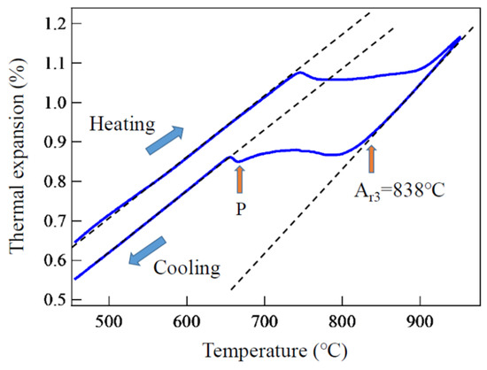 Transformation behavior upon cooling observed by dilatometry for 1.5Mn-1.5Si-0.2C steel. Perlite transformation started at point P. Reprinted from Ref. [11].