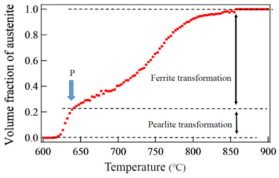 Change in austenite volume fraction during cooling determined by in situ neutron diffraction measurement for a 1.5Mn-1.5Si-0.2C steel. Pearlite transformation started at point P. Reprinted from Ref. [11].