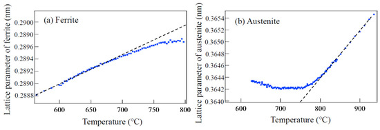 Thermal expansion coefficient for austenite was calculated using the austenite lattice parameter of 0.3646 nm at 820 °C. For ferrite , the ferrite lattice parameter of 0.2889 nm at 575 °C was used. The obtained results were as follows: