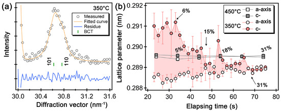 Features in ferrite diffraction profile: (a) Enlarged diffraction profile obtained after Rietveld refinement assuming BCT, (b) Changes in the lattice parameters of the a- and c-axis of the bainite phase as a function of elapsing time at 450 and 350 °C. Reprinted from Ref. [11].