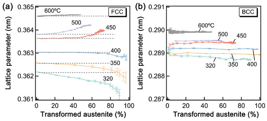 Changes in the mean lattice parameters of austenite (FCC) (a) and bainitic ferrite (BCC) (b) during isothermal transformations at various temperatures. Reprinted with permission from ref. [17]. Elsevier, 2025.