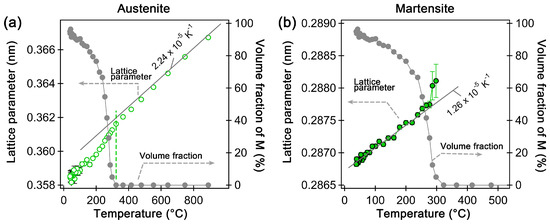 Lattice parameter and martensite volume fraction as a function of temperature during quenching: (a) austenite lattice parameter and (b) martensite lattice parameter assuming BCC structure. The green dashed line shows the Ms temperature. Reprinted with permission from ref. [2]. Elsevier, 2025.
