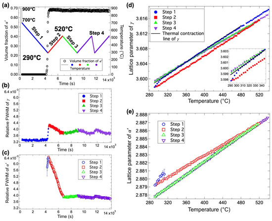 Martensitic transformation and tempering behavior during the cyclic cooling–heating process: temperature history and the corresponding changes in martensite volume fraction (a); changes in the relative FWHM of austenite 111 (b) and martensite 110 (c) reflections; and changes in the lattice parameters of austenite (d) and martensite (e). Reprinted with permission from ref. [29]. Elsevier, 2025.
