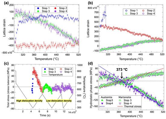 where refers to the lattice parameter of phase at temperature T, and refers to the stress- and defect-free one at the same temperature. The lattice parameters of austenite before the formation of martensite in step 1 (Figure 12d)) and its extrapolated values below the Ms temperature were used for . As mentioned earlier, the crystal defects may also change the lattice parameter. Here, the lattice parameters of the tempered single-phase martensite with a low density of crystal defects were used for . Figure 13a,b show the variations in and as functions of temperature, respectively. In Figure 13a, began to decrease as the martensitic transformation started. It then remained almost constant in step 2, despite changes in temperature, and later shifted to maintain a linear relationship with temperature in steps 3 and 4. The lattice parameter variations of austenite in steps 3 and 4 coincide with the prediction of thermal stress, but that in step 2 is not. Hence, it can be considered that another mechanism is responsible for raising the lattice parameter of austenite to counteract the thermal stress during the tempering in step 2. After the tempering, the lattice strain of austenite at 290 °C became tensile, which is composed of thermal misfit strain and transformation-induced phase strain (stress). In contrast, of the fresh martensite formed at the beginning was large, but it gradually decreased as the transformation progressed. During the subsequent cyclic heating–cooling, the lattice strain of martensite increased with temperature in steps 3 and 4, consistent with the thermal stress condition. Similar to the behavior observed in austenite, the variation in the lattice strain of martensite in step 2 cannot be explained only by the thermal misfit strain. After tempering, the lattice strain of martensite became compressive.