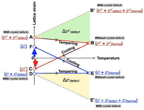 Figure 14 presents a schematic illustration of the lattice strain variations in martensite (A→B→C) and austenite (D→E→F) during tempering of the partially martensitic transformed specimen (steps 2 and 3 in Figure 12a). The tensile lattice strain of fresh martensite at A changed to a compressive one at C after tempering. The tempering of the full martensite microstructure demonstrated that the annihilation of dislocations decreased the lattice parameter (the details see [29]). Here, we can attribute the variation in the lattice strain of martensite to dislocation annihilation: Δ= A − C. The lattice strain variation between B and C was caused by thermal stress, as confirmed in Figure 13d. If we draw a line AB′ parallel to CB, the deviation between AB′ and AB corresponds to Δ, which is annihilated by tempering (at various tempering temperatures). Similarly, the contribution of crystal defects to the lattice strain of austenite is equal to (D − F), which is negative, as opposed to the effect of dislocations. Vacancy is another type of crystal defect, and its formation decreases the lattice parameter while causing overall volume expansion [17]. This effect is quite effective in relaxing hydrostatic phase stress induced by transformation strain.