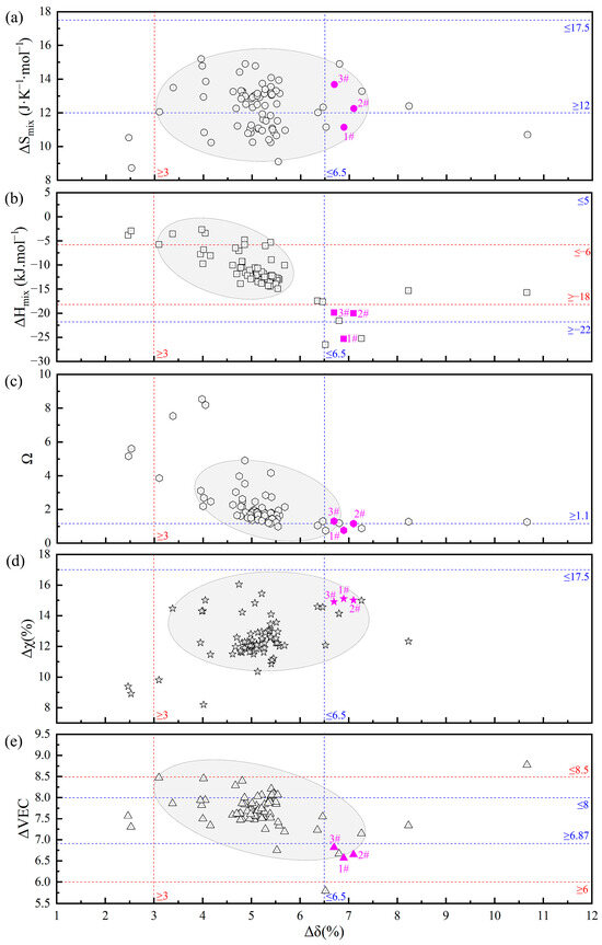 Confidence diagram of thermodynamic empirical parameters for FCC+BCC-type EHEAs: (a) ΔSmix; (b) ΔHmix; (c) Ω; (d) Δχ; and (e) ΔVEC.
