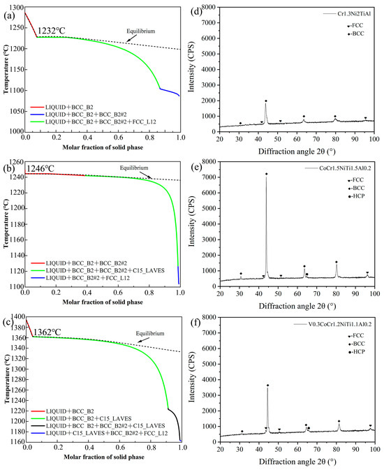 Solidification path diagrams and XRD results of the three new EHEAs: (a,d) Cr1.3Ni2TiAl; (b,e) CoCr1.5NiTi1.5Al0.2; (c,f) V0.3CoCr1.2NiTi1.1Al0.2.