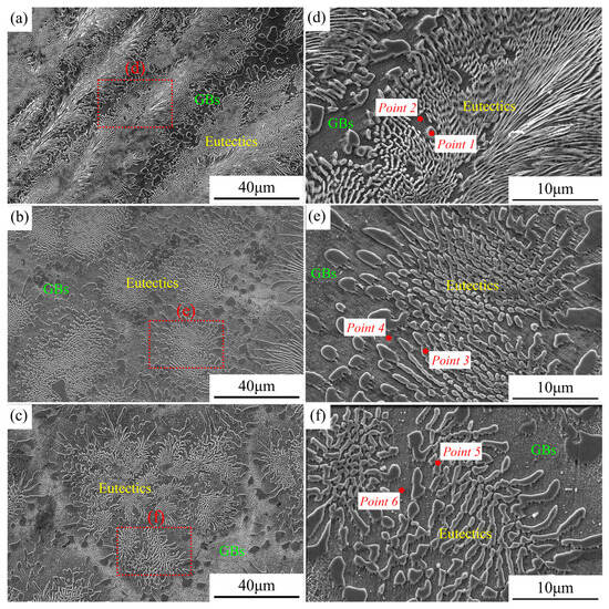 The microstructures of the three new EHEAs were shown in Figure 3. The eutectic structure of the alloy Cr1.3Ni2TiAl exhibited a feather-like appearance, while the eutectic structures of the alloys CoCr1.5NiTi1.5Al0.2 and V0.3CoCr1.2NiTi1.1Al0.2 appeared petal-like, with the grain boundary regions gradually increasing in size. The microstructures of the three novel EHEAs were fully eutectic, validating the accuracy of the design in this study. The three alloy groups exhibited irregular eutectic microstructures, rendering the quantitative characterization of the eutectic structure dimensions challenging. However, qualitative observations revealed that the eutectic structures systematically underwent progressive coarsening with increasing multiplicity of the principal alloying elements. The elemental composition of the eutectic structures in the three groups of samples was examined using SEM-EDS, and the results are presented in Table 4. In the microstructural morphology of the three EHEAs, the phase with higher potential in the eutectic structure was predominantly composed of the Cr element (Point 1, 3, and 5). In the Cr1.3Ni2TiAl sample, the low-potential phase was mainly composed of the Ni, Ti, and Al elements (Point 2). In both the CoCr1.5NiTi1.5Al0.2 and V0.3CoCr1.2NiTi1.1Al0.2 samples, the low-potential phases were primarily composed of the Co, Ni, and Ti elements (Point 4 and Point 6).