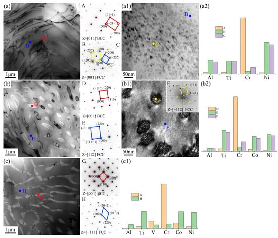 Figure 3 effectively validated that the three new EHEAs were successfully designed and fabricated, with the main differences in their microstructures reflected in the eutectic structure and grain boundary size. Therefore, TEM characterization was used in this study to conduct an in-depth analysis of these two regions, as shown in Figure 4 and Figure 5. The eutectic structures of the three EHEAs primarily consisted of the FCC and BCC phases, with the BCC phase (Points A, D, G) enriched in the Cr element. The FCC phase (Point B) in the Cr1.3Ni2TiAl alloy exhibited significant enrichment with Ni, Ti, and Al, accompanied by the formation of nanoscale precipitates (10–20 nm in diameter) with lattice parameters and elemental partitionning behavior identical to those of the ordered FCC matrix phase. The FCC phase (Point E) of CoCr1.5NiTi1.5Al0.2 was enriched in the Ni, Ti, and Co elements. Although the lattice structure and elemental distribution of the nanoscale precipitates were also similar to the matrix phase, their size (50–60 nm in diameter) was larger compared to those in Cr1.3Ni2TiAl. The FCC phase (Point H) of V0.3CoCr1.2NiTi1.1Al0.2 was also rich in the Ni, Ti, and Co elements, but no nanoscale precipitates were observed.